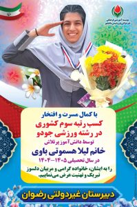 مقام کشوری توسط دانش آموز ورزش کار مدرسه رضوان بانوی جودوکار شایسته شهر چمران...